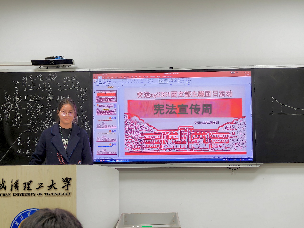 为深入学习宣传贯彻习近平法治思想,迎接我国第十二个国家宪法日。12月11日下午五时,交运zy2301团支部在主楼315教室成功举办“学习宣传贯彻习近平法治思想,推动宪法深入人心”主题团日活动。活动由团支书沈畅主持,全体团员青年积极参与。
