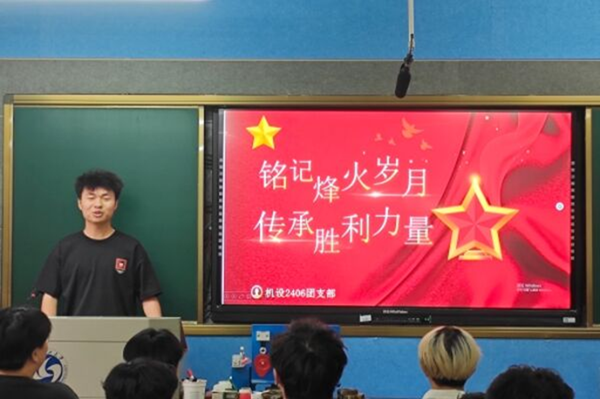 为纪念中国人民抗日战争暨世界反法西斯战争胜利80周年,深入贯彻学习习近平总书记关于弘扬伟大抗战精神的重要论述,引导青年学生厚植爱国情怀、坚定理想信念, 9月24日机设2406团支部在西配楼111教室开展“铭记烽火岁月,传承胜利力量”主题团日活动。本次活动由团支书闵宇轩主持,全体团员参加。