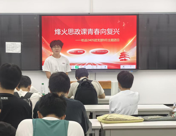 为纪念中国人民抗日战争暨世界反法西斯战争胜利80周年,9月24日,机设2405团支部在实训楼402开展了九月主题团日活动。本次活动由团支书贾鸥翼主持,全体团员共同参与。