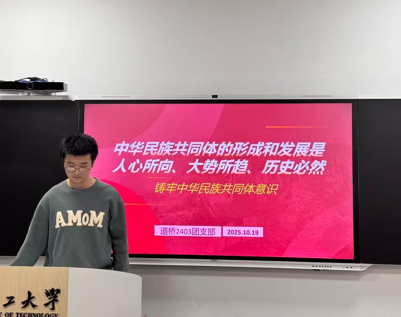 为深入贯彻学习中华民族共同体意识,认识中华民族共同体的形成和发展是人心所向、大势所趋、历史必然。10月19日,道桥2403团支部在余区教学主楼215教室开展“铸牢中华民族共同体意识”主题班团活动,由团支书黄宗翰主持,所有团员到场参加。