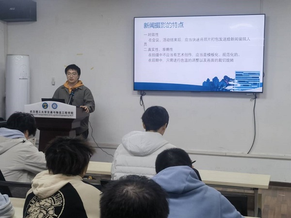 首先,由影像中心的苏俊达同学主讲新闻摄影技巧,他从构图技巧、光线运用、拍摄角度选择三个核心维度进行讲解,考虑到学生干部日常多使用手机拍摄,苏俊达特别针对手机摄影技巧进行重点分享,包括开启网格线辅助构图、利用手机专业模式调节参数等方法,他还展示了学院以往活动中的优秀新闻图片与问题图片对比,让同学们更直观地理解摄影技巧的实际应用。