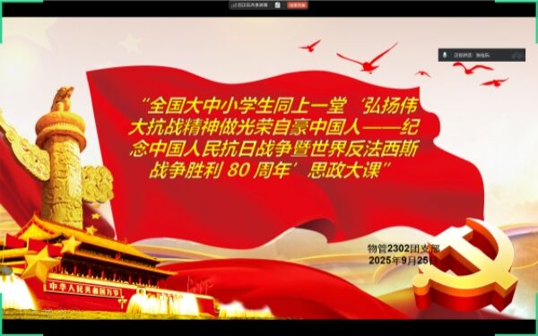 为引导青年团员从伟大抗战历史中汲取精神力量,深刻把握伟大抗战精神在当下的价值,进一步强化历史责任感与爱国情怀,物管2302团支部于9月25日线上开展了“全国大中小学生同上一堂‘弘扬伟大抗战精神做光荣自豪中国人——纪念中国人民抗日战争暨世界反法西斯战争胜利80周年’思政大课”主题团日活动。本次活动由团支部书记张佳乐主持,物管2302团支部全体成员共同参与。