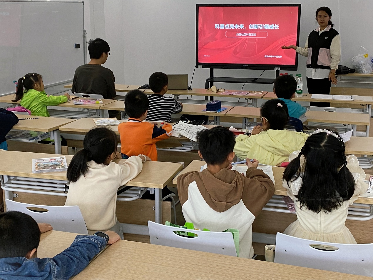 另9月21日上午,五名支部成员代表来到纺器社区进行科普志愿活动,主持人李欣然为少先队员们进行了共青团知识的科普。此次志愿服务不仅让红色种子在童心中悄然萌芽,更使青年团员们在"教育者必先受教育"的实践中淬炼初心。