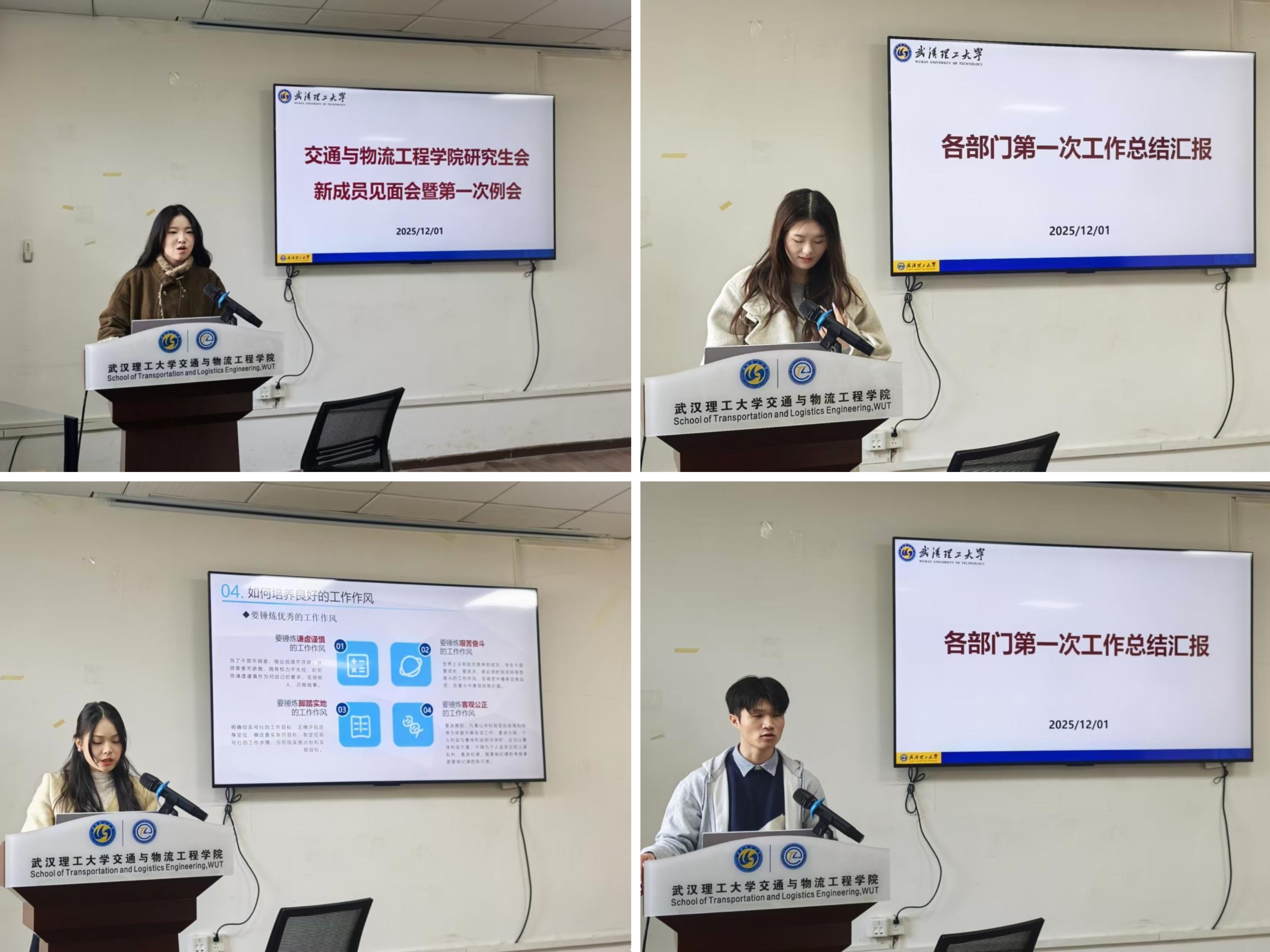 研究生会各部门依次开展第一次工作报告。办公室负责人徐平洋,全面总结本学期行政协调、文件管理等工作,梳理了流程优化中的不足,承诺后续将提升事务处理效率,强化部门服务支撑能力。权益部负责人童英其,回顾了本学期权益调研、问题反馈等特色活动,提出下一阶段将拓展权益收集渠道,更及时响应研究生在科研、生活中的需求。宣传部负责人谭左韬,总结了宣传平台运营、活动推广等成果,计划后续创新内容形式,增强研究生会影响力与内容传播力。