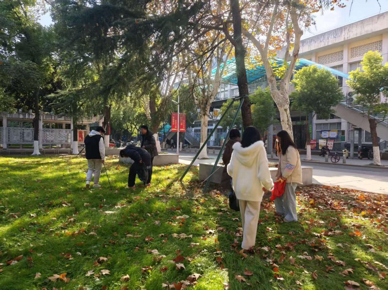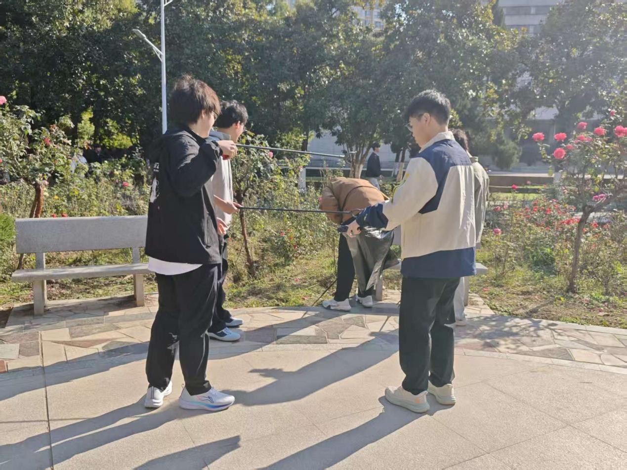 活动筹备阶段,团支部委员提前召开讨论,结合校园实际划分清洁区域,制定详细方案。从清洁工具的采购、分配到各小组任务清单的拟定,同学们群策群力,充分体现了高效的组织协调能力。团支书曹芷珊特别强调:“劳动不仅是体力付出,更是团队协作与责任意识的锤炼。”活动当天,第一小组负责月季园周边垃圾清理,挥舞扫帚的身影形成一道道流动的风景线;第二小组专注于一食堂前草坪垃圾清理,手持夹子细致捡拾碎石与纸屑;第三小组则对宣传栏、座椅等公共设施进行擦拭消毒。当发现绿化带内难以清理的垃圾时,同学们自发组成“攻坚小队”,互相配合完成清理任务,现场一派热火朝天的协作景象。