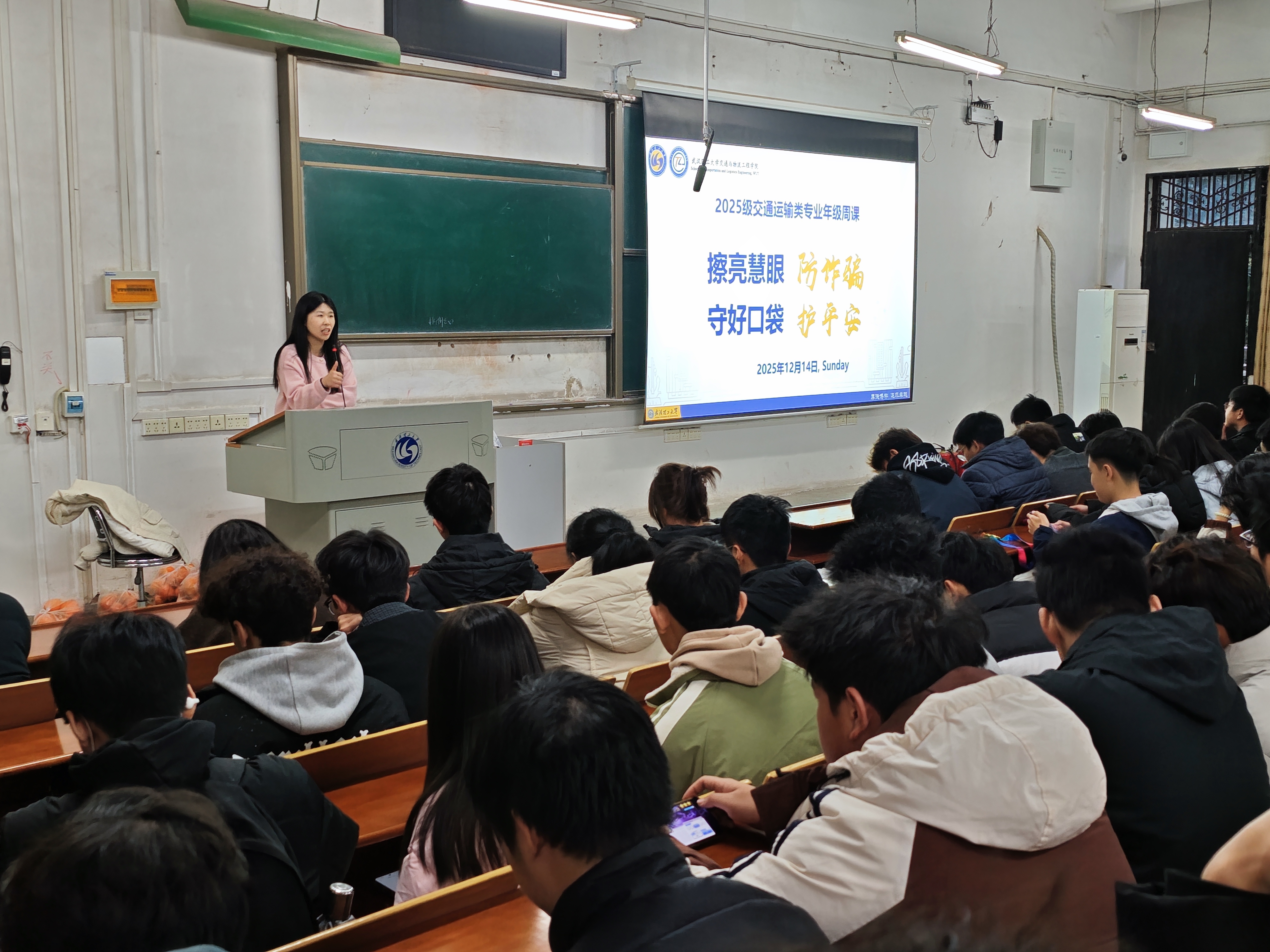 为切实增强新生安全防范意识,筑牢校园安全防线,同时强化学生考风考纪意识,树立诚信应考观念,2025年12月14日,2025级交通运输类专业、交运博学班以安全及纵欲和诚信考试为主题的年级周课在东配楼101教室顺利开展。本次周课由辅导员孙研老师主讲,全体同学参与学习。
