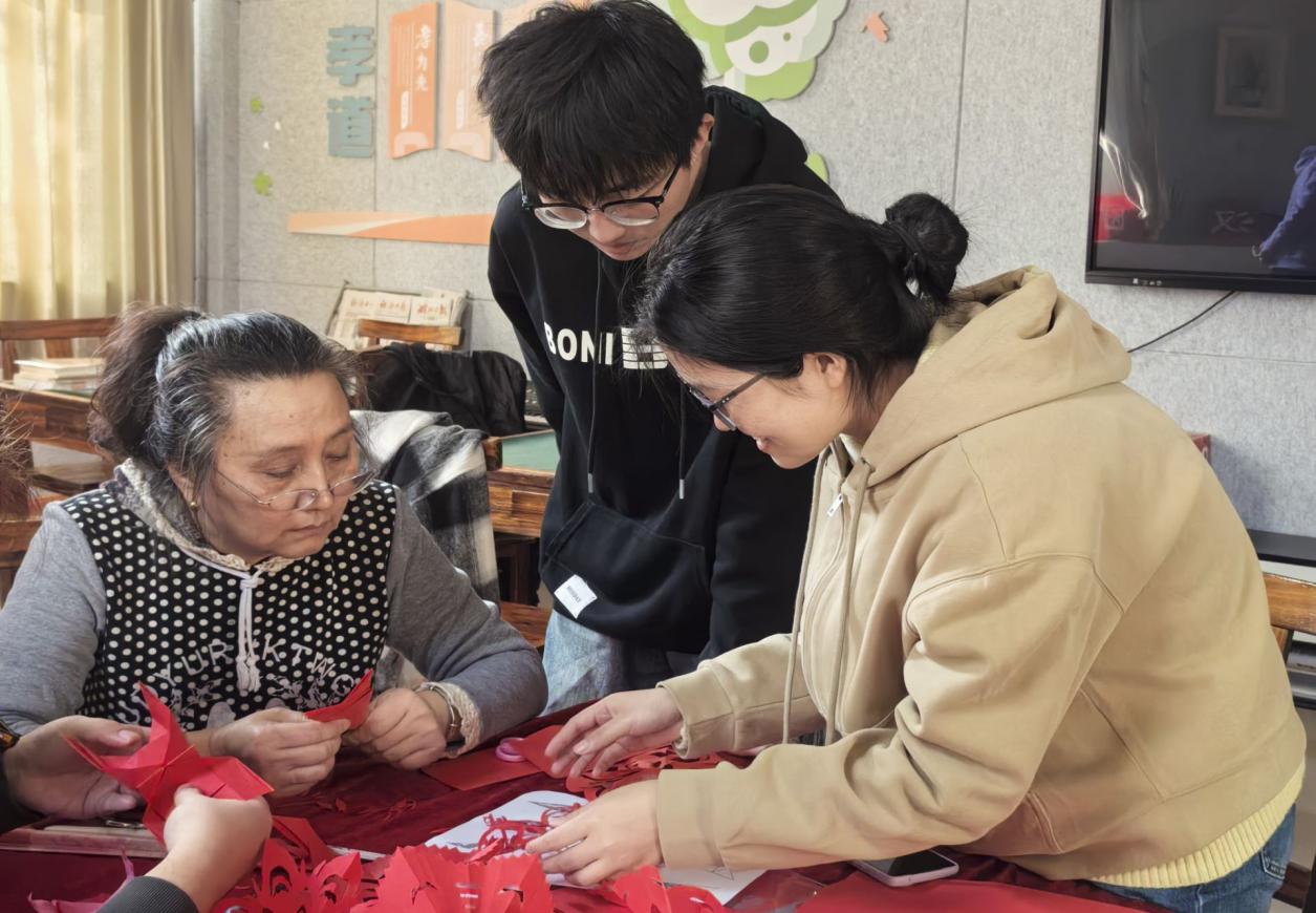 活动伊始,团支部成员先集中学习剪窗花、折蝴蝶技法并反复练习;随后与老人“一对一”结对,拉家常、聊生活,迅速拉近彼此距离。接着,大家手把手教老人剪出心仪图案,再一步步指导折出栩栩如生的蝴蝶。在同学们的协助下,老人们顺利完成作品,脸上洋溢着满足与喜悦。