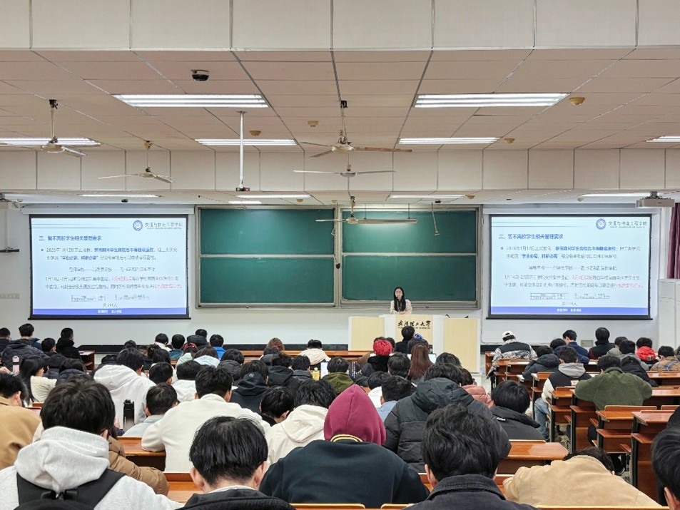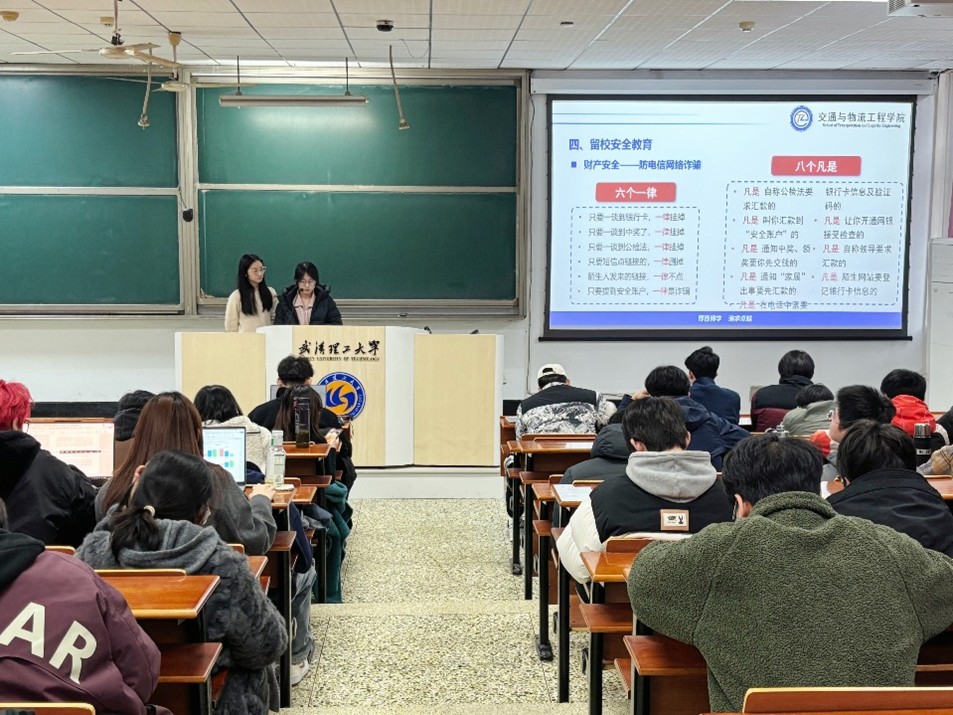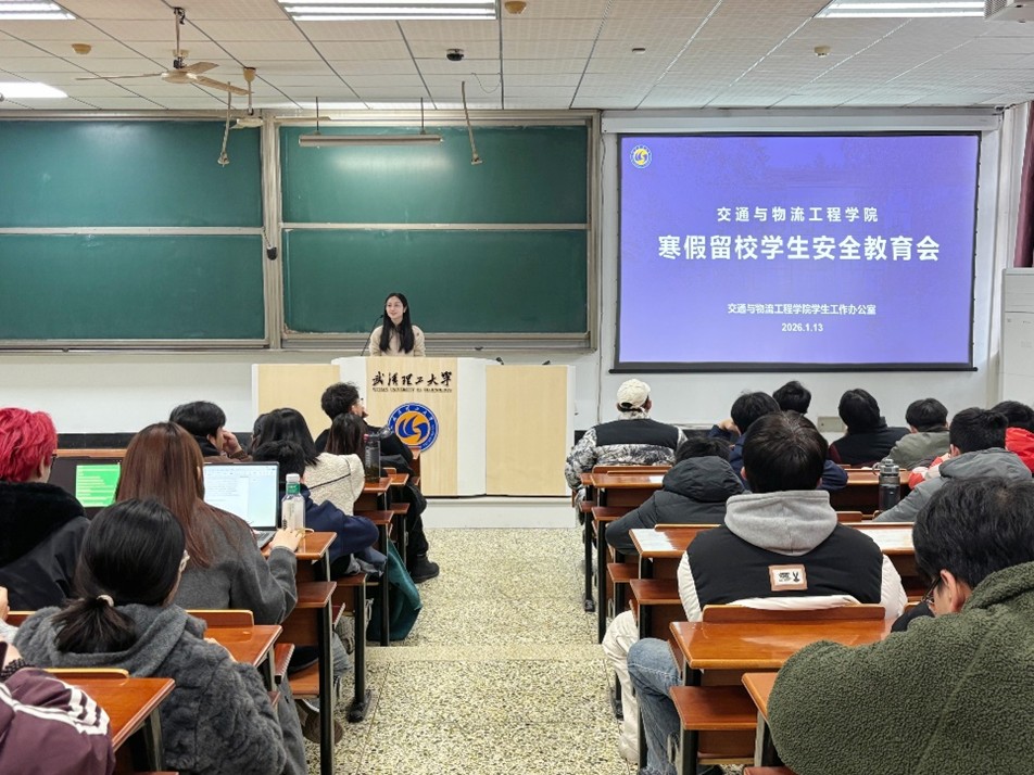1月13日,交通与物流工程学院在航海楼107举办寒假留校学生安全教育研学讲堂。本次讲堂由2025级研究生辅导员杜茜娅老师担任主讲人,全体留校研究生参与。
